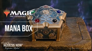 The Magic: The Gathering – Premium Card Box in Mana Design is a hexagonally shaped casket made of resin with elaborate black-gold décor and five colored semi-precious stone imitations on the removable lid – one for each mana type. Handcrafted and hand-painted, it's also perfect for storing dice, counters, or that one deck you only play on special occasions!