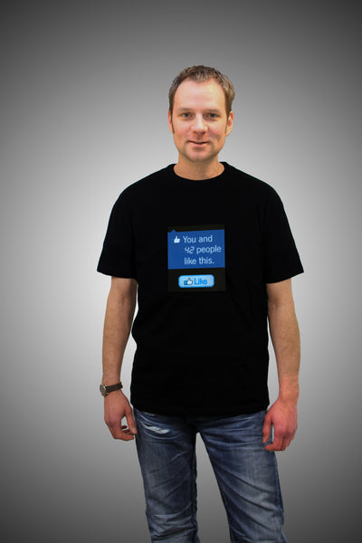 The T-shirt is interactive: others (including yourself, of course) can simply press the Like button in the middle and the built-in module then automatically counts up. Because of the electroluminescent film, this is best seen when it is darker. By the way, you can find out exactly how this works in our blog.