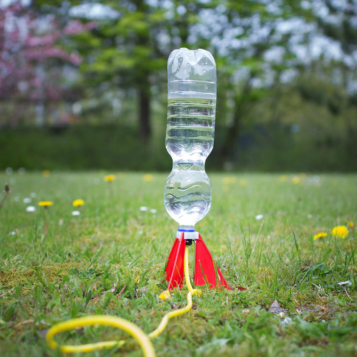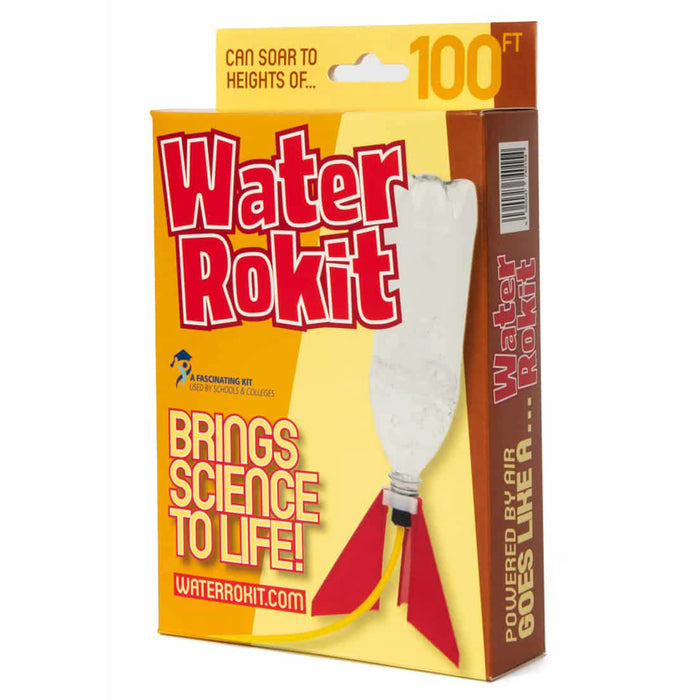 ¡Con el juego de cohetes botella Waterrokit, podrás construir tu propio cohete volador! El montaje es muy sencillo: coges una botella de plástico, la llenas con la cantidad de agua especificada, enroscas el tapón de rosca Waterrokit con las aletas y empiezas a bombear aire en su interior utilizando una bomba de bicicleta. En cuanto se haya acumulado suficiente presión, el cohete saldrá disparado a metros de altura por una fuente de agua. Y no te preocupes, tanto el tapón de rosca como la válvula de la manguera de aire están normalizados para que se adapten a las botellas y bombas de aire disponibles en el mercado. Y si quieres llevar a cabo experimentos aún más emocionantes con tu cohete Waterrokit, en el libro de experimentos Rokit encontrarás consejos y trucos para sacarle el máximo partido al cohete.