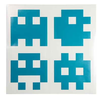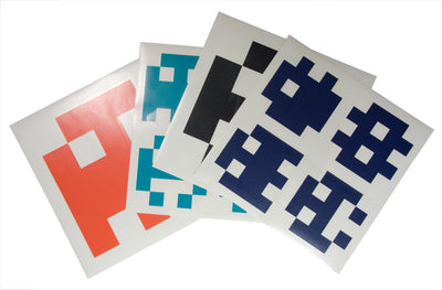 Un paquete contiene 16 pegatinas pequeñas (14x14cm) y 4 grandes (28x28cm) en diferentes formas compuestas por píxeles en los colores negro, azul oscuro, turquesa y rojo anaranjado. Como estás acostumbrado con nuestras pegatinas, son autoadhesivas y removibles. Se incluye una guía de pegado en alemán e inglés.