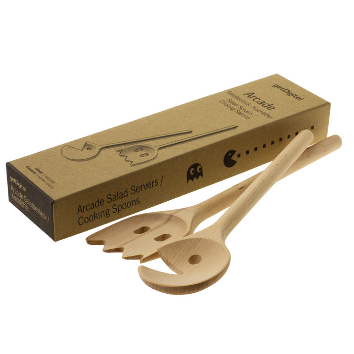 Si aún no estás convencido, quizá te convenza nuestro juego de cucharas de madera Arcade. Hechas de madera de haya, estas cucharas traen a la cocina un círculo glotón y un fantasma de la época dorada de los juegos arcade, y pueden ayudarte a superar tu miedo a las verduras. Si eres tan fundamentalista en tus opiniones como algunos de nuestros colegas, también puedes palear ensalada de patatas, bacon o filetes de un lado a otro con las cucharas ;) Por supuesto, también son estupendas para remover en ollas humeantes.