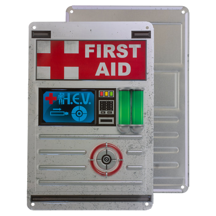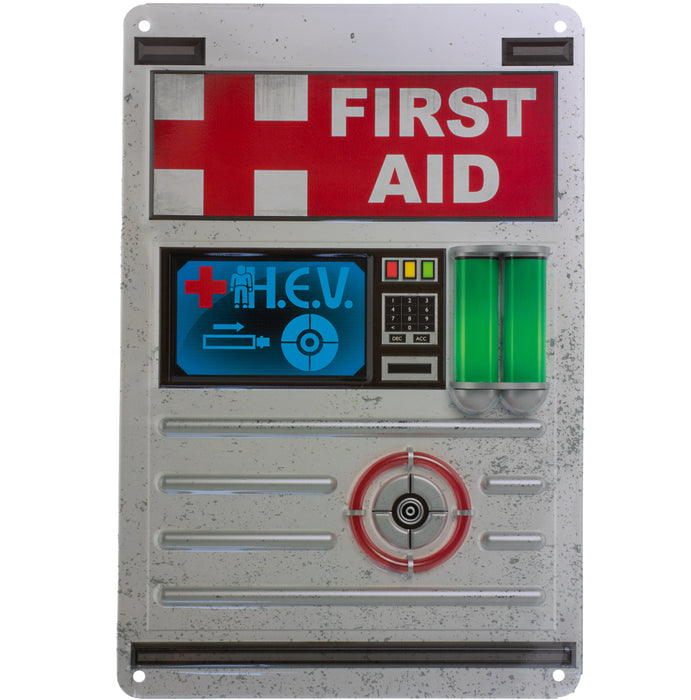 • Cartel metálico con la imagen de una estación de regeneración de salud de un conocido juego de disparos en primera persona