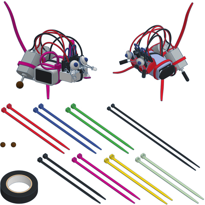 • El set de ampliación, de nombre sencillo, contiene, entre otras cosas, 2 ruedas esféricas de alta velocidad, cinta adhesiva para trazados de líneas, 14 bridas para cables de colores y 2 bridas para cables negras. Con estos componentes, ¡tu robot puede superar mejor las superficies irregulares e incluso alcanzar el doble de velocidad en superficies planas!