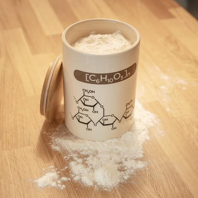 Während die meisten von uns froh sind, die Chemie gemeinsam mit der Schule hinter uns gelassen zu haben, vergessen wir zu oft, dass sie überall lauert. Denn letztendlich ist ja selbst backen nichts anderes, als ein chemisches Experiment. Deswegen haben wir passenderweise den Mehl Vorratsbehälter mit der chemischen Formel ihres Inhalts entwickelt. So kannst du dich dort mit der Chemie umgeben, wo sie stattfindet – ohne deinen Einrichtungsstil der grellen Labor-Ästhetik zu opfern. Dank des Bambusdeckels mit Silikondichtung kann das Mehl auch keine unerwünschten Verbindungen eingehen. ;)