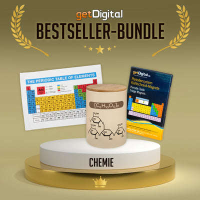 In unserem Shop findest du alles, was das Nerd-Herz begehrt – und noch ein paar Sachen mehr. Denn wir entwickeln auch gerne mal selbst Produkte, die es so noch nicht gibt. Wie zum Beispiel eine Vorratsdose für (C6H10O5)n und ein Geschirrhandtuch, sowie Kühlschrankmagnete mit dem Periodensystem! Im getDigital Bestseller-Bundle: Chemie bekommst du diese drei von uns selbst entwickelten Produkte zum reduzierten Preis!