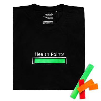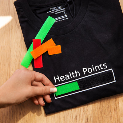 Affinché tutto il mondo possa vedere a colpo d'occhio come stai, la maglietta dei Punti Salute ti fornisce la tua barra della salute portatile: Nel campo bianco delineato troverai una striscia di velcro nera alla quale potrai attaccare le strisce colorate in dotazione. L'immagine a sinistra mostra un esempio di striscia di velcro. Camicia Pazienza Pazienza. Le strisce rosse, arancioni e verdi possono essere facilmente accorciate con le forbici se vuoi enfatizzare una certa quantità di HP. In questo modo tutti sapranno come stai andando e quali cose hanno un effetto diretto sui tuoi HP.
