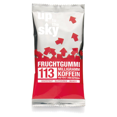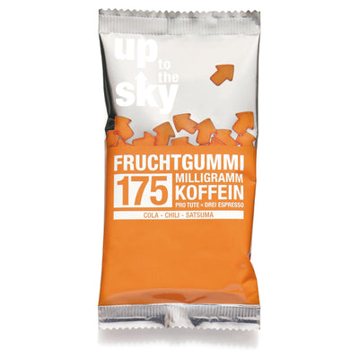 Con le gomme alla frutta alla caffeina di Up to the Sky puoi aumentare i tuoi livelli di energia senza rischiare brutte macchie di caffè, labbra bruciate e bruciori di stomaco. Queste deliziose caramelle sono disponibili in comode confezioni da 50 g.