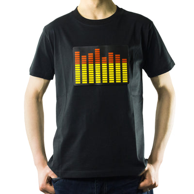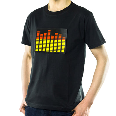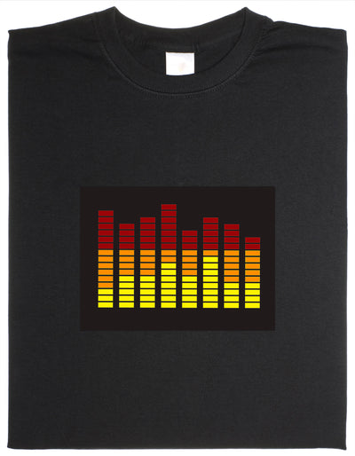 Dit Equalizer Shirt is voorzien van een ingebouwde grafische equalizer - de balken op de voorkant van het shirt bewegen mee met de achtergrondgeluiden en geven zo de binnenkomende geluiden weer. Dus vergelijkbaar met een normale equalizer. Perfect voor concerten, de disco of gewoon de volgende geek bijeenkomst. Aangezien de gevoeligheid van het shirt kan worden ingesteld, kan het shirt alles van gesprekken tot discomuziek weergeven.
