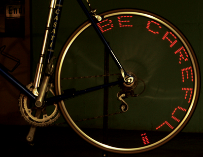 De Bike Messenger is een klein apparaatje voorzien van LED's, dat je tussen de spaken van een fiets kunt bevestigen. Zodra je sneller dan 6 km/u rijdt, wordt ofwel een van de 6 vooraf ingestelde berichten, de huidige snelheid of zelfs een eigen bericht met maximaal 13 tekens weergegeven. De weergave gebeurt door wisselend knipperende LED's, afhankelijk van de positie van het apparaat. Door de traagheid van het oog wordt dan de illusie van een constante tekst gecreëerd.