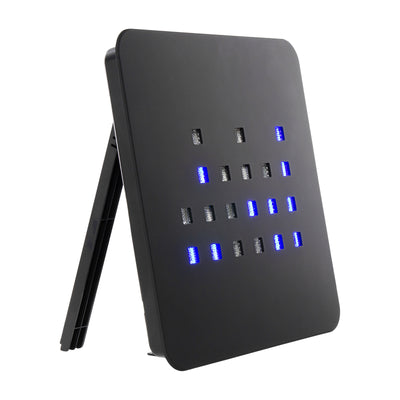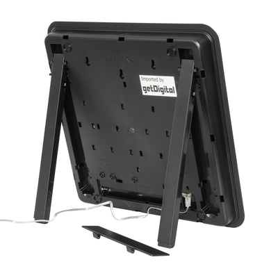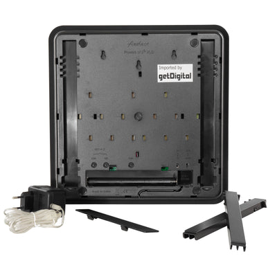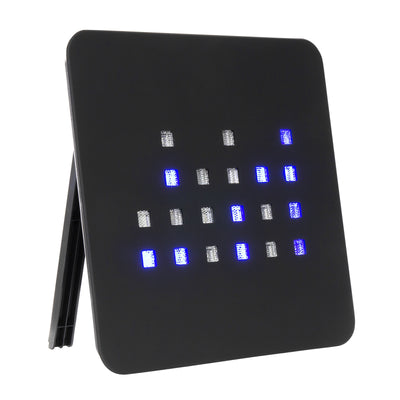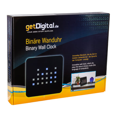 De Binaire Wandklok heeft blauwe LED's en is ongeveer 31x31cm groot en ongeveer 3,2cm diep. Je kunt hem aan een muur hangen of met de bijgeleverde standaard neerzetten. De klok heeft 3 helderheidsniveaus en heeft een constante netvoeding nodig (230V, Euro stekker). Om de tijd bij stroomuitval te behouden, kunnen 3 AA-batterijen worden geplaatst (batterijen niet inbegrepen). Natuurlijk wordt er ook een uitgebreide handleiding in het Duits, Engels, Frans en Spaans meegeleverd.