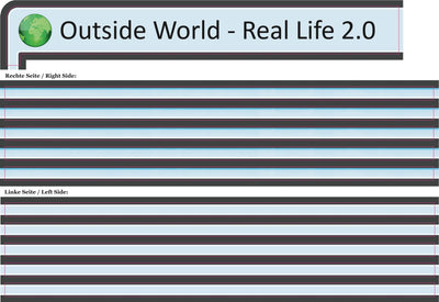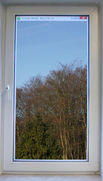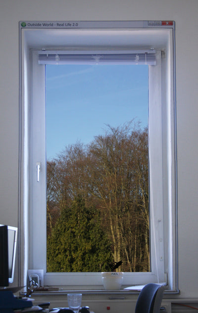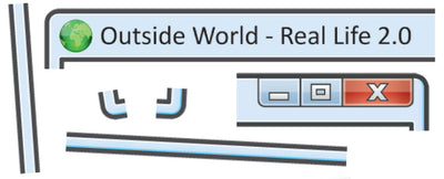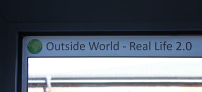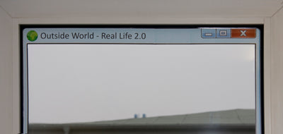 Das Computerfenster für Dein echtes Fenster trägt die Beschriftung "Outside World - Real life 2.0" ("Die Welt da draußen - das echte Leben 2.0") mit einem Globus zur Veranschaulichung. Auf diese Weise sollten zwischen Computer und sogenannter Realität keine Verwechslungen mehr passieren können ;)
