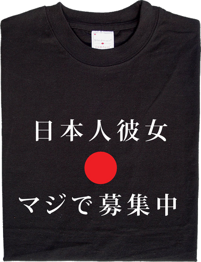 Een shirt uit onze reeks voor Japan-fans: De kanji (Japanse karakters) op dit shirt lezen "Nihonjin kanojo majide boshuchu", wat (in volgorde) "Japanner", "vriendin", "serieus" en "gezocht" betekent. Samen dus "Japanse vriendin serieus gezocht".