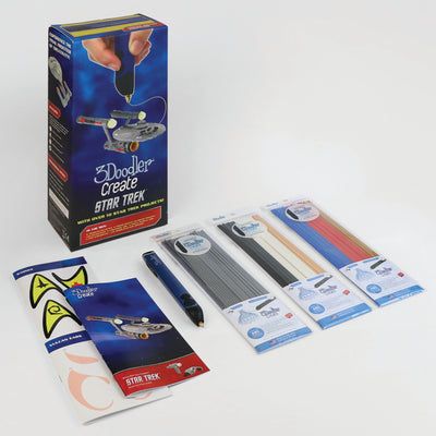 Das 3Doodler 3.0 Create Star Trek Special beinhaltet ein Star Trek Project Kit und kommt mit 100 Kunststoffsträngen sowie Schablonen, mit denen man Gegenstände aus dem Star Trek Universum nachbauen kann. Du kannst aber selbstverständlich auch bei uns im Shop Nachfüllpakete aus allen drei Materialien in Deiner gewünschten Farbe bestellen. Hier geht's zu ABS, PLA und Flexy.