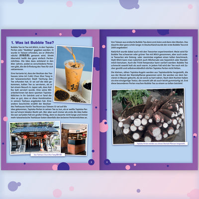 In der Box findest du 3 Sorten Tee – Grüner Tee Latte, Milchtee und Zitronen-Eistee –, passende Strohhalme und natürlich die namensgebenden Tapioka-Perlen. Das Besondere an ihnen ist, dass sie nur 2 bis 5 Minuten gekocht werden müssen, statt wie sonst üblich 30 Minuten. Wie genau du die Perlen und überhaupt das ganze Getränk zubereiten kannst, erfährst du in der beiliegenden 24-seitigen Broschüre! Darin findest du außerdem ein Rezept für die momentane Trendsorte Brown Sugar, die du mithilfe des asiatischen Rohrzuckers in deiner Box ebenfalls ausprobieren kannst.