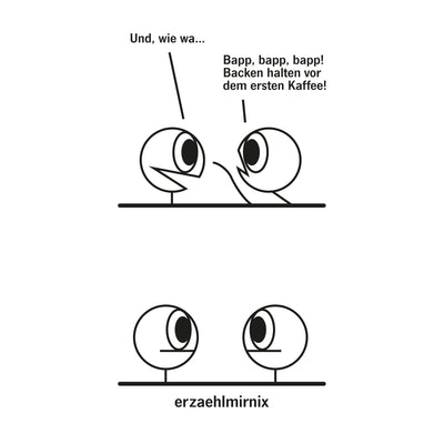 Was ist die erste Regel des Bürolebens? Nicht anfangen, zu reden, bevor Dein Gegenüber mindestens einen Kaffee intus hat. Was ist die zweite Regel des Bürolebens? Nicht anfangen, zu reden, bevor Dein Gegenüber mindestens einen Kaffee intus hat. Du merkst: So schwierig ist die ganze Chose nicht. Trotzdem sind wir öfters gezwungen, genau das zu tun, was auf dem erzaehlmirnix-Becher „Bapp Bapp Bapp“ zu sehen ist: Einfach laut Bapp Bapp Bapp rufen und die gesamte Umgebung daran erinnern, dass es die anfangs erwähnten Regeln gibt, die unbedingt befolgt werden müssen! ;)