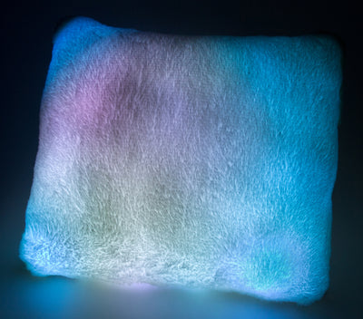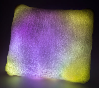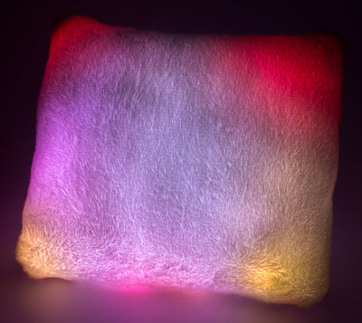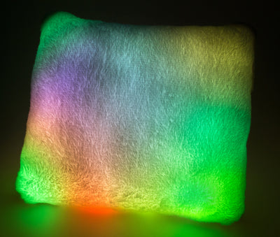 Wenn man das LED Kissen nämlich in der Mitte drückt, setzt man dadurch ein zyklisches Lichtspiel aus langsam wechselnden bunten Farben in Gang.