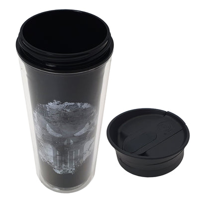 Der schwarze Becher mit Punisher-Logo hält dein Getränk warm und sieht auch noch cool aus.