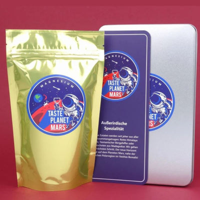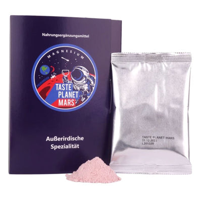 Dieses Mineralpulver besteht nämlich nur aus Bestandteilen, die nachgewiesenermaßen auch auf dem Mars existieren, unter anderem Magnesium und verschiedene Mineralsalze. Es eignet sich bestens dazu, mit Wasser oder anderen Flüssigkeiten gemischt zu werden, wobei im Pulver enthaltenes Eisenoxid dem Getränk eine marsrote Färbung gibt. So kann das Pulver z.B. für den farbenfrohen Cocktail "Mars Rendezvous" verwendet werden, für den du nur etwas Sekt oder Mineralwasser sowie Blue Curaçao-Sirup hinzufügen musst. Natürlich kannst du dir mit diesem interstellaren Nahrungsergänzungsmittel auch deine ganz eigenen Getränke-Kreationen ausdenken! Solche marsianischen Getränke sehen jedenfalls nicht nur gut aus, sondern können durch das enthaltene Magnesium auch dazu beitragen, Müdigkeit zu verringern.