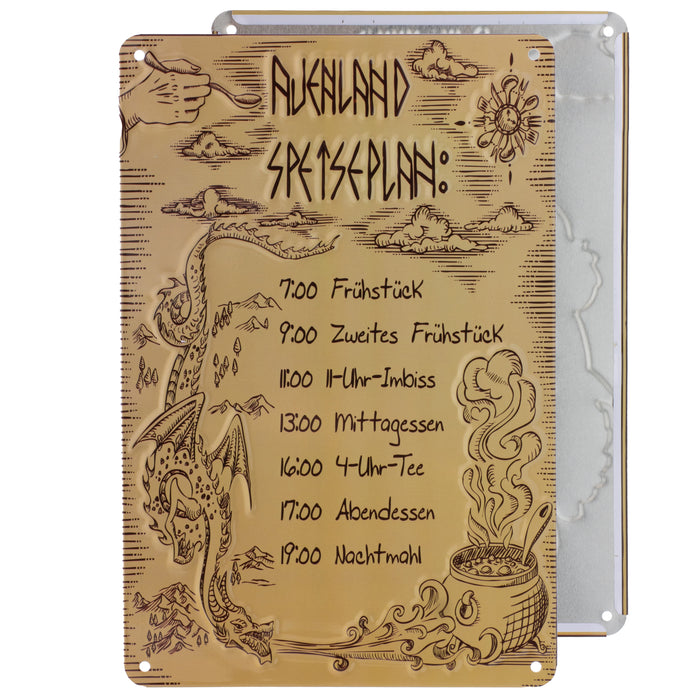 Der Tagesablauf der Halblinge dagegen ist bestens bekannt und genau durchgetaktet. Falls du feststellst, dass die sogenannte Auenland-Diät Auch für dich genau das richtige ist, hilft dir das Blechschild Auenland Speiseplan, um immer auf dem Laufenden zu bleiben, welche Mahlzeit als nächstes ansteht. Immerhin müssen die meisten davon vorbereitet oder gekocht werden, sodass du am besten ein bis zwei Stunden vorher keine Termine mehr haben solltest.