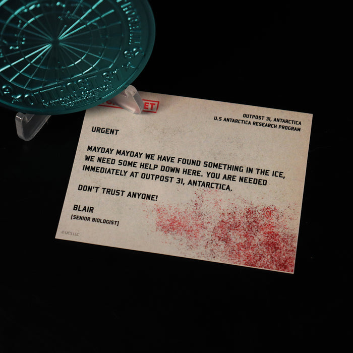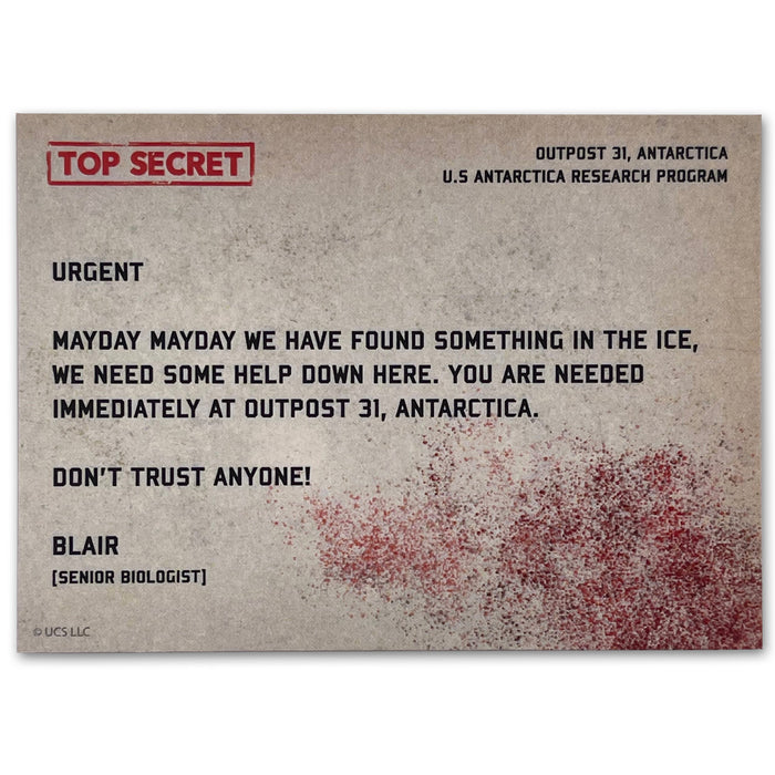 • Zeigt auf der einen Seite eine Karte der Antarktis mit Schriftzügen der Forschungsstation „Outpost 31“ und dem Jahr der Veröffentlichung des Films 1982