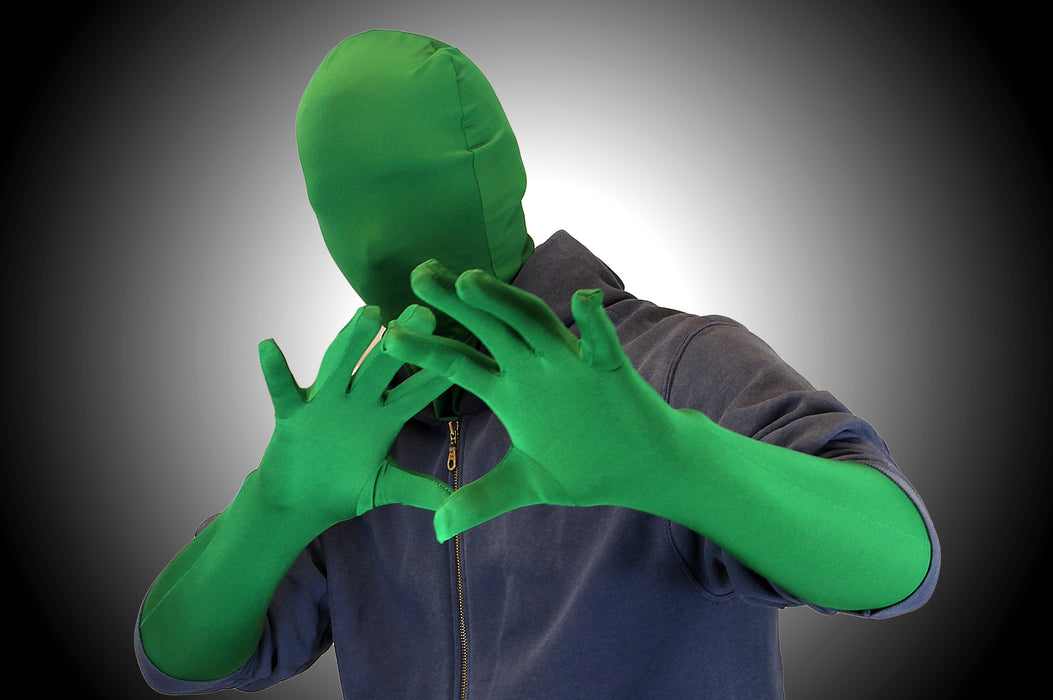 Der schicke, grüne Dreiteiler, den wir hier für Dich haben, hat nämlich einen gewaltigen Vorteil: Er ist.. ein Dreiteiler und kein Overall (haben wir das schon erwähnt?)! Das bedeutet, dass Du Deine ganz normale Kleidung tragen und den Rest - das sind in der Regel Hände und Kopf - dann einfach mit dem grünen Stoff bedecken kannst. Die Handschuhe sind ca. 51cm lang und reichen damit etwa bis zum Ellenbogen. Auch die Kopfbedeckung hört nicht gleich am Kinn wieder auf, sondern fällt fast bis über die Schulter, so dass auch ein normaler Ausschnitt bedeckt ist.