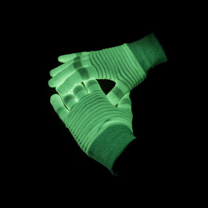 Das Leuchten wird durch einen phosphoriszierenden Stoff erreicht, der in die Handschuhe eingearbeitet ist. Werden die Handschuhe einige Zeit natürlichem oder künstlichem Licht ausgesetzt, leuchten sie für mehrere Stunden, was umso besser zu sehen ist, je dunkler es ist. Natürlich leuchten die Handschuhe auch im Schwarzlicht. Wie gut also, dass Schwarzlicht in den meisten Discotheken Standard ist: So ausgestattet trauen sich auch Geeks auf die Tanzfläche! Sehr gut passen die Handschuhe aber z.B. auch zum abendlichen Joggen, da Du mit den Handschuhen von jedem Autofahrer sofort gesehen wirst.