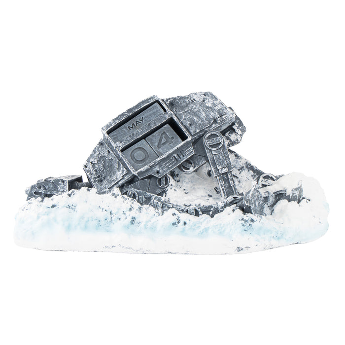 Dieses liebevoll gestaltete Diorama mit Dauerkalenderfunktion fängt den epischen Moment aus "Das Imperium schlägt zurück" ein, nachdem die Rebellen auf Hoth, angeführt von Luke Skywalker, den imperialen All Terrain Attack Transporter (kurz: AT-AT) mit Harpunen und Abschleppseilen zu Fall gebracht haben. Das Datum lässt sich durch herausnehmbare Würfel leicht einstellen, so dass der Kalender jedes Jahr wieder neu verwendet werden kann. Neben dieser praktischen Funktion ist er auch optisch ein echter Hingucker.