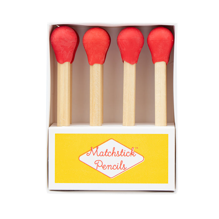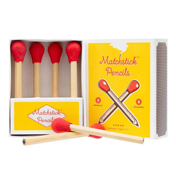• Set aus 8 Bleistiften mit Radiergummi in Form von Streichhölzern in einer Streichholzschachtel