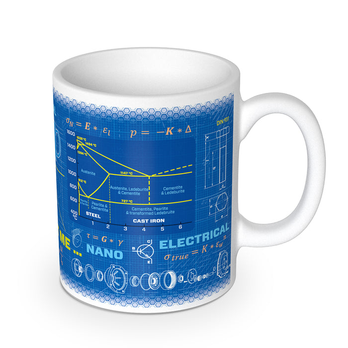Na gut, der letzte Satz ist vielleicht ein bisschen übertrieben, aber nur ein Blick auf den Wissenschaftsbecher "Maschinenbau" zeigt, womit sich die Halbgötter in Karohemden so herumschlagen: Die Grundlagen der Statik, ein Spannungs-Dehnungs-Diagramm, die Sechskantschraube nach DIN 931 - ohne diese Dinge würden uns Autos, Flugzeuge und Co. wahrscheinlich um die Ohren fliegen (wenn sie denn überhaupt anspringen würden). Und natürlich darf auf dem Becher auch nicht die 3-Tafel-Projektion fehlen, die einige sicherlich noch aus ihrem Studium kennen und "lieben". ;)
